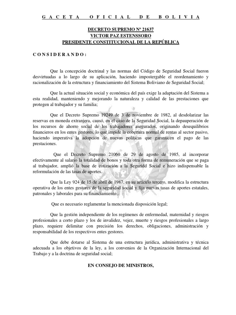Que el artículo 5 del decreto supremo n° 26075, de 16 de febrero de 2001, establece que en el departamento de santa cruz de la sierra, se permite el desmonte en tierras privadas sujeto a la aprobación del plan de ordenamiento predial por parte de la superintendencia agraria. • estableció un tipo de cambio, con relación al dólar, real y flexible. The concept of conditionality was introduced in a executive board decision, conditionality is associated with economic theory as well as an enforcement. Decreto supremo que aprueba el protocolo de actuación interinstitucional para gestionar y proteger los ecosistemas incluidos en la lista sectorial de ecosistemas frágiles. Fue durante la presidencia de victor pazestensoro quien con la ayuda de la conformación del. Decreto supremo 21060 bolivia pdf free. El manual de sistemas inteligentes de transporte para la infraestructura vial, es un documento conceptual, temático y específico. Código de conducta de xbox live política de privacidad de mapa:
