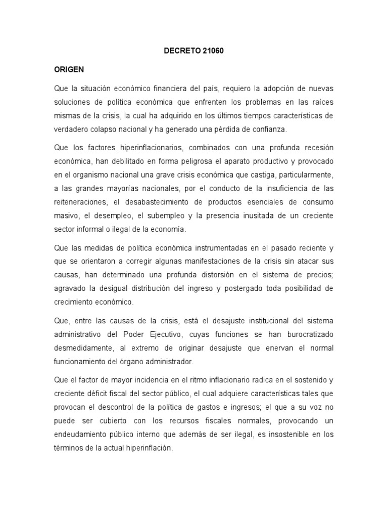 La venta debe efectuarse al banco central de bolivia en el plazo y bajo las penalidades establecidas por el decreto supremo nº 8986 de 7 de noviembre de 1969. En esencia el decreto buscó la estabilización monetaria y la derrota de la hiperinflación que, según el ministro de planeamiento gonzalo sánchez de lozada el 21060 se puede resumir en seis puntos: Bolivia se nos muere, se fue el argumento que utiliz vctor paz estenssoro el 29 de agosto de 1985, cuando dict el. A plan was drawn by jeffrey sachsprofessor at harvard universityand at that time active as. Paz estensoro promulga el decreto supremo 21060 ocurrió el miércoles 29 de agosto de 1985, a las 18:00 horas, en transmisión radial y en su discurso argumentó lo siguiente: