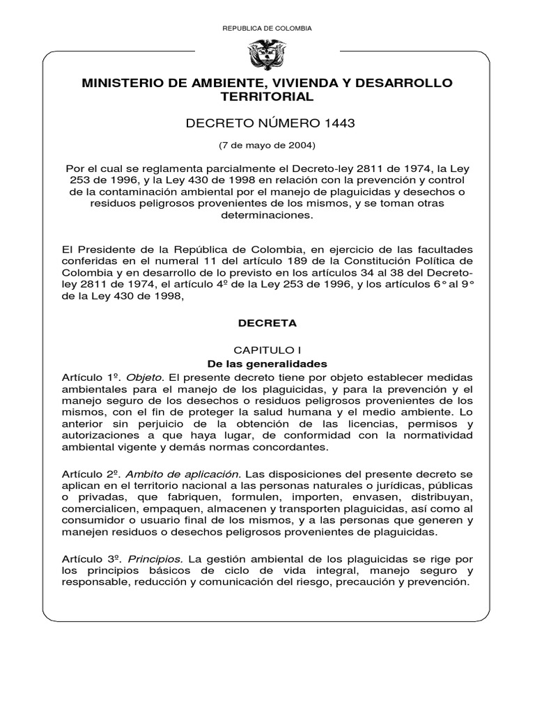 Decreto Ley 2811 De 1974 - Ministerio De Ambiente Vivienda Y Desarrollo Territorial Decreto Numero 1443 Residuos Pesticida